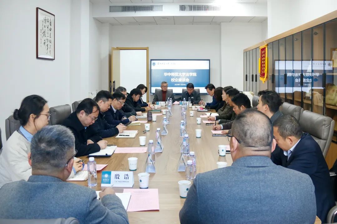 11月29日,法学院校企座谈会于法学院313会议室顺利举行。法学院党委书记杨臣、党委副书记万枞,副院长文杰、肖登辉,2025届研究生辅导员团委书记张永基,2025届本科生辅导员、团委副书记何青苗,以及华图教育武汉分公司公职师资总监朱超、北京兰台(武汉)律师事务所副主任金凡、国浩律师(武汉)事务所行政主管廖小方等12家企业代表人参与座谈,座谈会由万枞主持。
