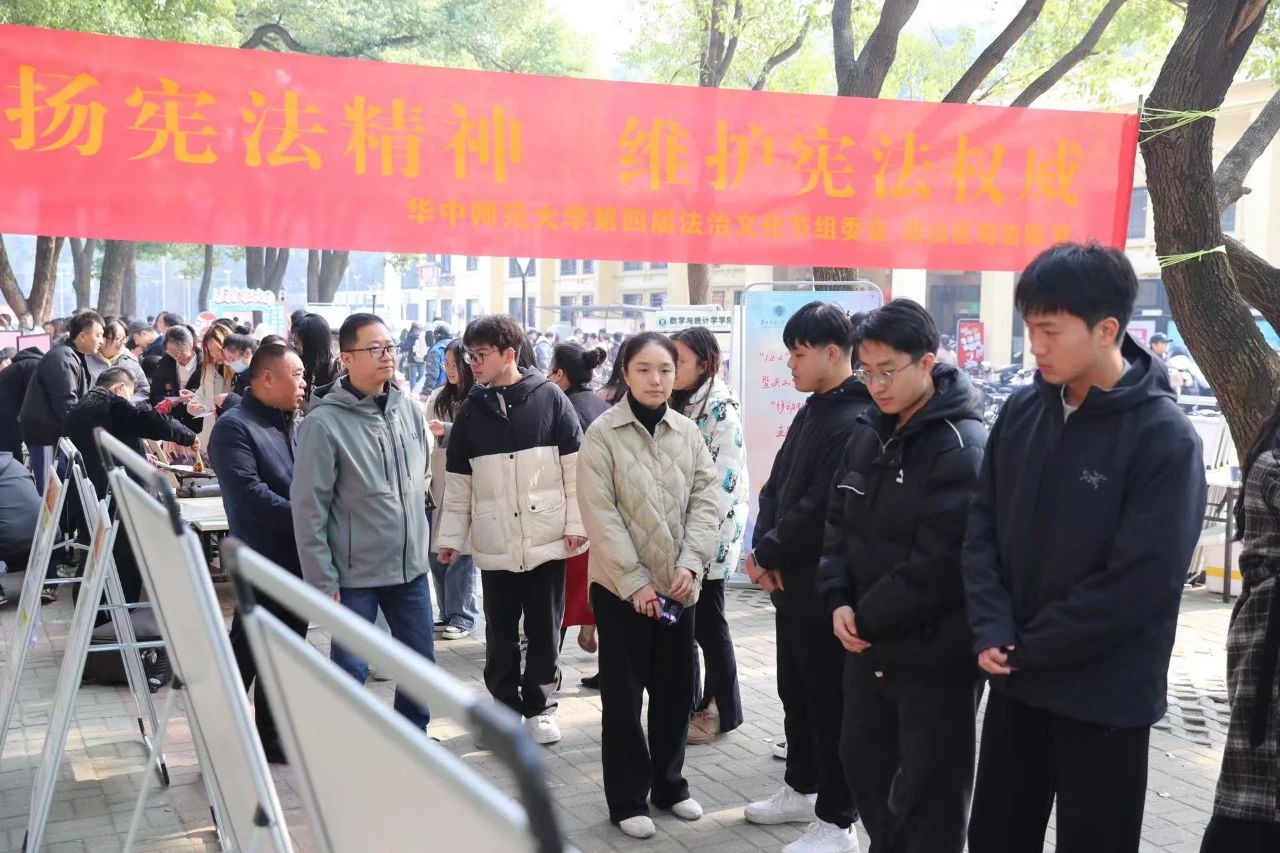 12月3日,国家宪法日法治游园会在东区小树林与东十八宿舍楼下举行,洪山区委常委、区委宣传部部长邵峰,区委宣传部副部长廖红艳,区司法局党组书记、局长刘海情,区司法局党组成员、副局长熊远峰等洪山区委、洪山区司法局领导莅临现场,法学院党委书记杨臣、党委副书记万枞、副院长肖登辉、文杰,以及法学院教师石先钰、王勤、朱良,团委书记张永基、副书记何青苗等出席游园会。活动现场人声鼎沸,气氛热烈,吸引不少华师学子踊跃参加。