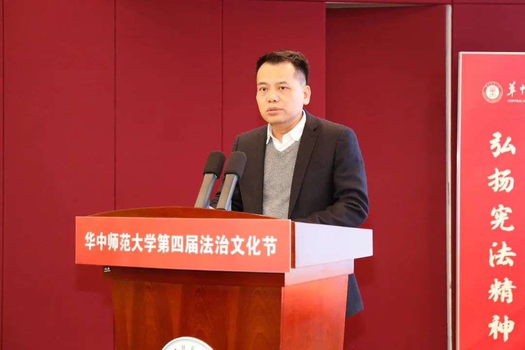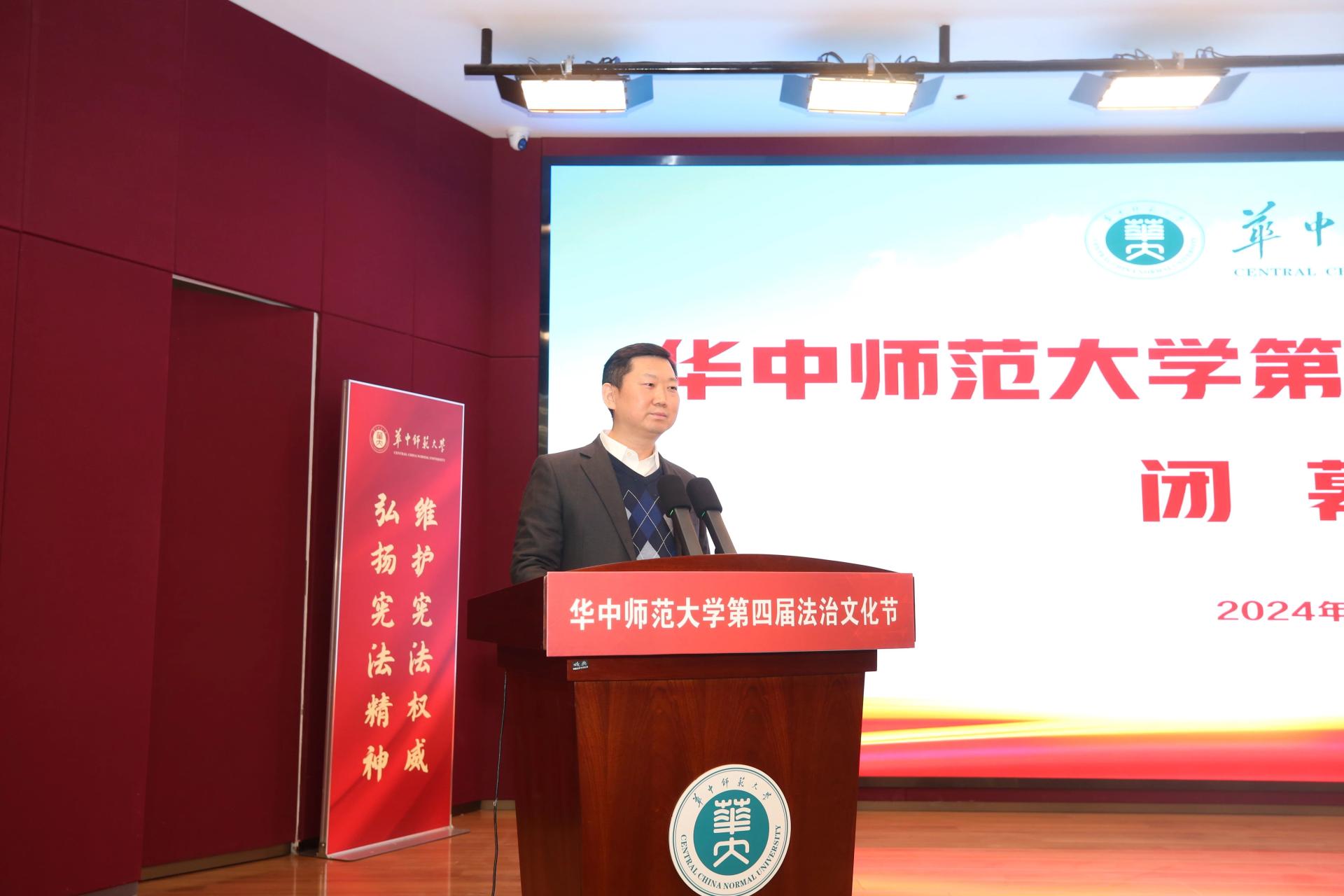12月13日,华中师范大学第四届法治文化节闭幕式在文科科研楼一楼报告厅举行。校党委副书记、纪委书记刘继文,湖北省司法厅普法与依法治理处处长顾丹、学校办公室主任徐刚、后勤保障部部长袁本芳、法学院党委书记杨臣、法学院院长丁文,学校办公室副主任刘阳、党委宣传部副部长钟文锐、党委学工部思政处副处长李宪玲、保卫处副处长柳亚涛,广东(广和)律师事务所主任卢成尤,马克思主义学院副处职组织员刘方、经济与工商管理学院党委副书记陈娟、外国语学院党委副书记陈哲、物理科学与技术学院党委副书记马英、人工智能教育学部党委副书记李娜、法学院副院长文杰、肖登辉和学校办公室、公共管理学院、化学学院、美术学院、广东(广和)律师事务所等单位的师生代表200余人出席,法学院党委副书记万枞主持闭幕式。