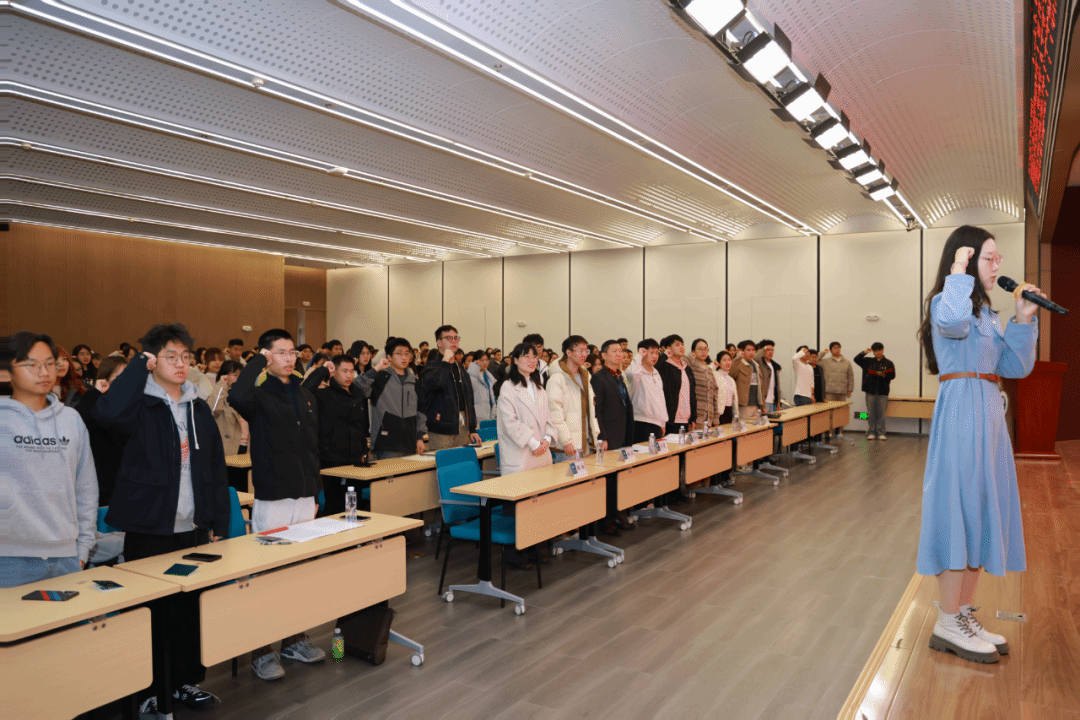 在研究生团总支书记李芷毓的带领下,全体新团员面向团旗庄严宣誓。全体团员共同举起右拳,庄严诵读入团誓词,铿锵的誓言在会场回荡,这既是新团员的郑重承诺,也是在场所有团员代表一次理想与信念的重温。