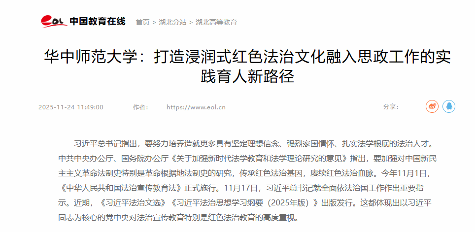 近日,我院将浸润式红色法治文化融入思政工作的实践育人探索获湖北省司法厅肯定,批示指出,华中师范大学法学院将红色法治文化与思政教育结合,为法治湖北建设提供了可资借鉴的高校范式。