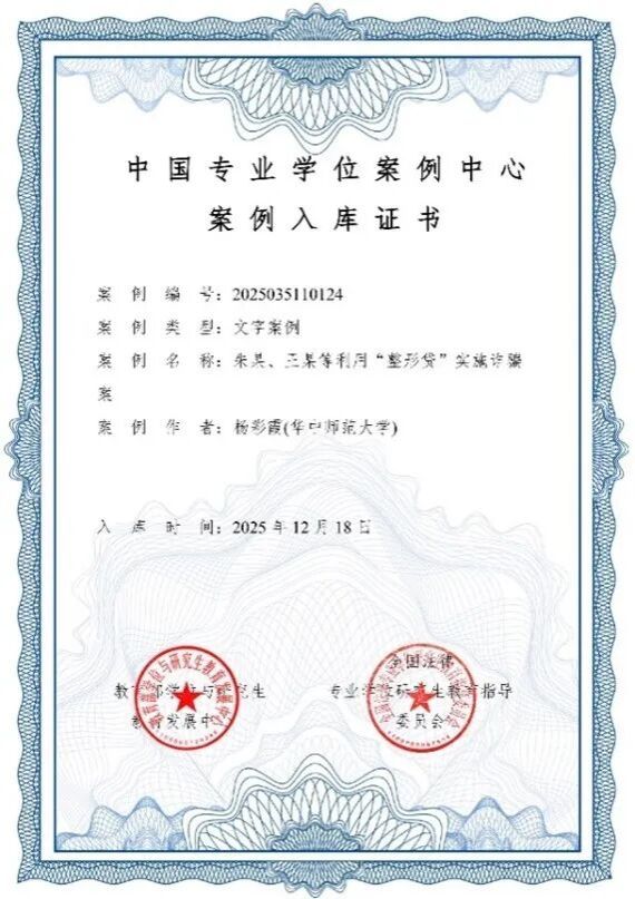 近日,全国法律专业学位研究生教育指导委员会公布了第五批法律硕士专业学位文字教学案例评审结果,我院杨彩霞老师、沈斌老师及硕士研究生崔芃凡、胡超祥撰写的《朱某、王某等利用“整形贷”实施诈骗案》 《蚂蚁金服集团、蚂蚁微贷公司与朗动科技公司不正当竞争纠纷案》两项教学案例,历经专家评审及全国法律专业学位研究生教育指导委员会审议,成功入选“中国专业学位案例中心案例库”,充分展现了我院在法律专业学位研究生教育领域的教学创新成果。