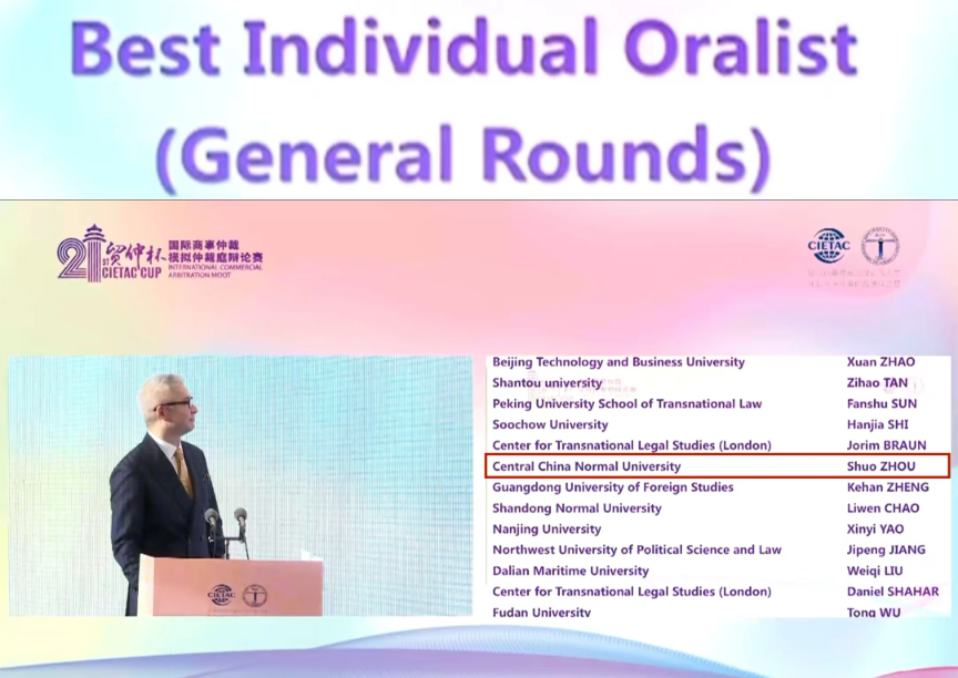 法学院讯(通讯员 徐妮娜 周硕)2023年11月29日至12月8日,由中国国际经济贸易仲裁委员会主办的第二十一届“贸仲杯”国际商事仲裁模拟仲裁庭辩论赛(以下简称“贸仲杯”)成功举办。华中师范大学法学院Vis Moot队10名本科生参赛,2021级本科生周硕荣获循环赛最佳辩手(Best Individual Oralist)奖。