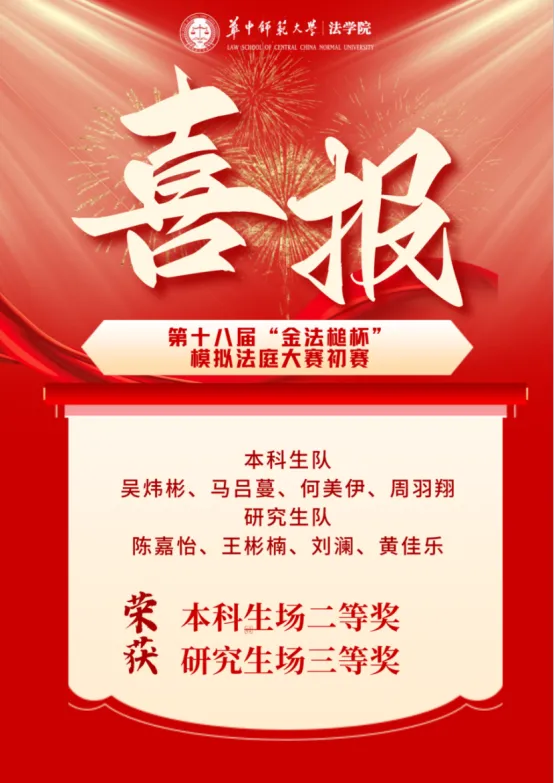 法学院讯(通讯员 吴炜彬)3月28日,第十八届“金法槌杯”模拟法庭大赛初赛圆满结束,华中师范大学代表队团结协作、顽强拼搏,取得本科生场二等奖、研究生场三等奖的优异成绩,其中本科生代表队成功晋级决赛。