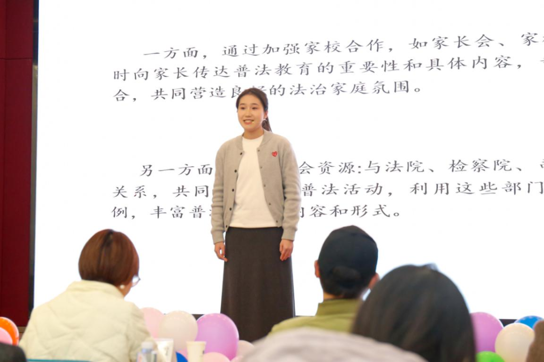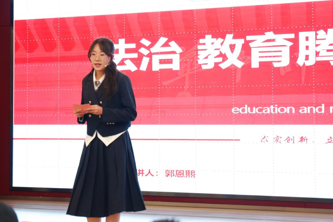 郭恩熙的演讲题目是“法治,教育腾飞的翅膀”。她认为,法治犹如一双强劲有力、不可或缺的翅膀,为教育现代化保驾护航,引领教育冲破重重迷雾,向着光明璀璨的未来翱翔。