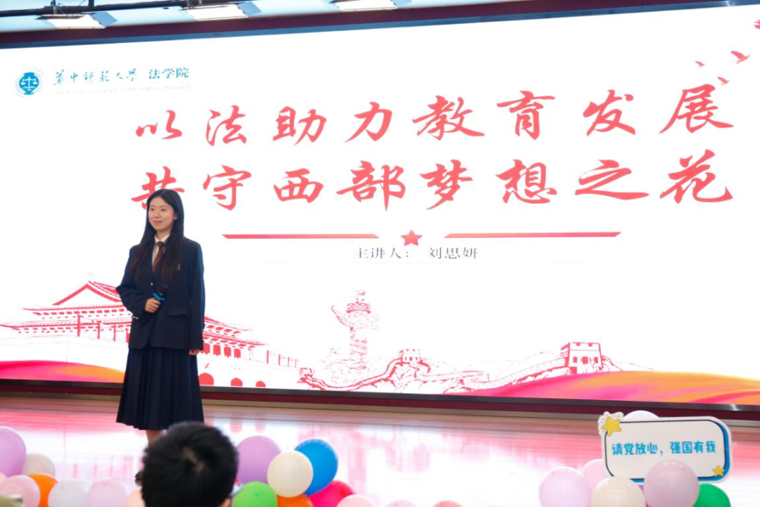 刘思妍演讲的主题是“以法助力教育发展,共守西部梦想之花”。她通过讲述大伯西部支教和西藏学姐求学的故事,阐述了教育是点亮未来的明灯,法治是守护教育的坚固堡垒。在她的讲述下,我们看到在广袤的西部大地上,教育与法治正携手共进,书写着动人的篇章。