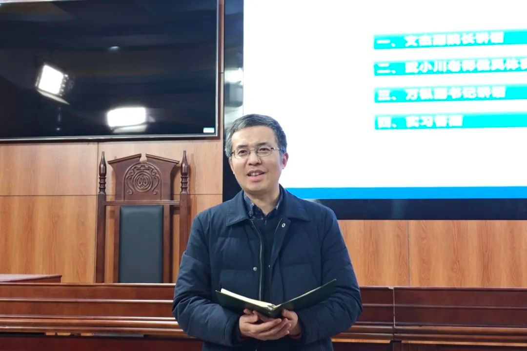 2月28日,我院在8号教学楼8611模拟法庭召开2023级法律硕士集中实习动员大会,我院党委副书记万枞,副院长文杰,研究生辅导员张永基、陈志超出席会议,实习负责教师武小川,实习指导教师代表曹奕阳, 2023级全体法律硕士参加会议。会议由武小川主持。