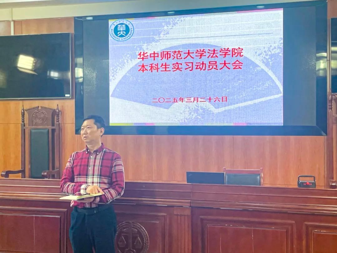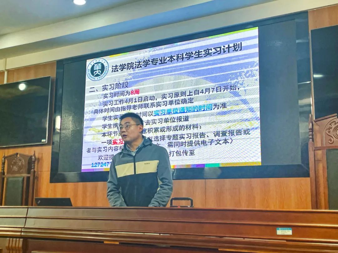 3月26日,我院在8号教学楼8611模拟法庭召开2022级本科生集中实习动员大会,我院党委副书记万枞,副院长肖登辉出席会议,实习主管教师聂圣,实习指导教师陶文婷、熊林曼、陈丽、张罡、陈伟、李运达,2022级全体本科生参加会议。会议由聂圣主持。