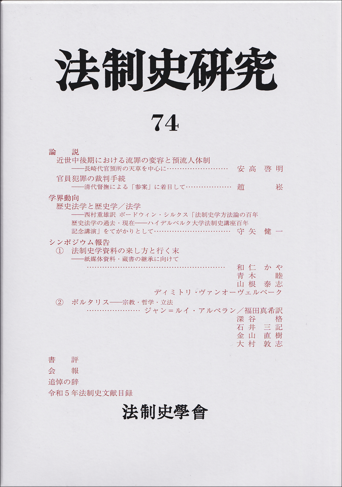 近日,日本权威法史期刊《法制史研究》(第74号)正式刊发了我院赵崧老师的学术论文,题为《官員犯罪の裁判手続——清代督撫による「参案」に着目して——》,全文约日文38000字。该文聚焦于清代督抚“参案”程序在官员刑事案件审理中的实际运作。通过对《大清律例》及题本、奏折等档案文献的梳理,揭示了官员涉案时与平民审判流程的显著差异,并在与滋贺秀三所提出的“必要的覆审制”进行对话中,揭示出清代司法体系中官员身份所引发的审慎性与多层级复核特征。文章从制度运作视角出发,为理解清代审判制度提供了新的分析路径。