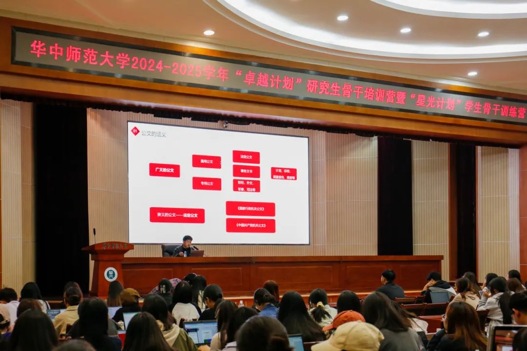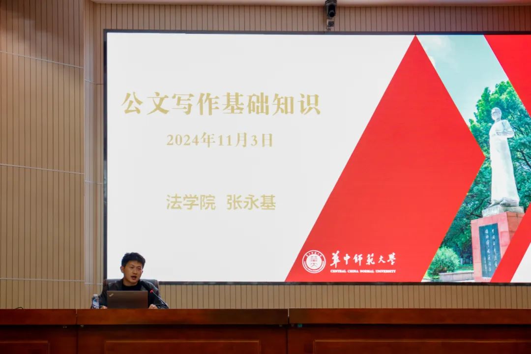 11月3日,华中师范大学2024-2025学年“卓越计划”研究生骨干培训营暨“星光计划”学生骨干训练营的公文写作培训在科学会堂一楼报告厅顺利举行。本次培训活动由华中师范大学研究生会主办,法学院研究生会承办,法学院团委书记、研究生辅导员张永基担任主讲人,华中师范大学学生会、华中师范大学研究生会及各学院(学部、中心)研究生会骨干成员200余人参与培训。培训由法学院第十三届研究生会主席团成员陈志超主持。