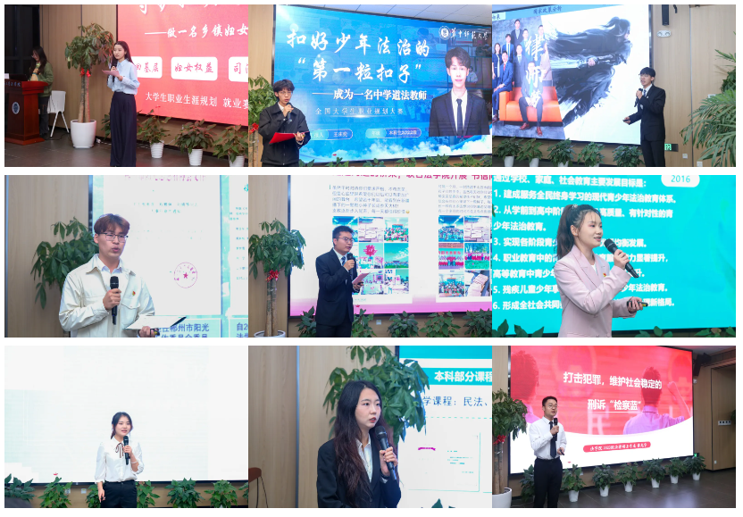 在成长赛道中,10位选手依次展示个人职业规划。胡欣洁、李昀霄、雷佳欣和蒋妍分别以未成年人公益律师、法律援助律师、民工权益保障律师和基层未成年人检察官为职业目标,讲述职业认知与未来规划。吴雨欣、刘思妍和林彦晨则聚焦于道德与法治教师的职业方向,从职业目标探索、成长路径及对基层法治教育的感悟等方面进行展示。林婧和李远志将职业目标定位于学术研究方向,多角度展示了对于自己在法律实证研究中的潜力。郭天琪立志成为法治新闻记者,从基层调研经验和融媒体技能切入,围绕法治传播与公众意识提升,展现了对创新传播形式和社会影响力的深刻思考。