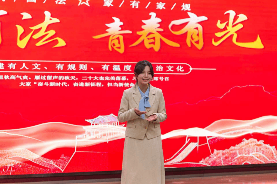 新闻传播学院的张渲宁通过董丽娜、唐帅等人物事迹,倡导广大青年主动为法治发声,汇聚法治微光照亮未来。