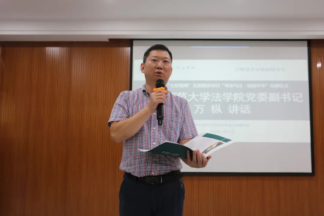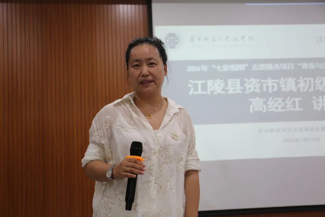 法学院讯(记者 林彦晨 马文静)7月21日下午,我院法伴青春志愿服务队在江陵县资市中学举行“七彩假期”结课仪式。学院党委副书记万枞、资市中学校长高经红、党支部副书记荣卫、副校长张晓百、我院校友、盈科(荆州)律师事务所合伙人徐明红律师、荆州司法局人民参与和促进法治科科长章凯,学院团委书记张永基、副书记姜孝文,服务队全体队员和资市中学全体在校学生参加仪式。仪式由服务队队员龙媛媛主持。