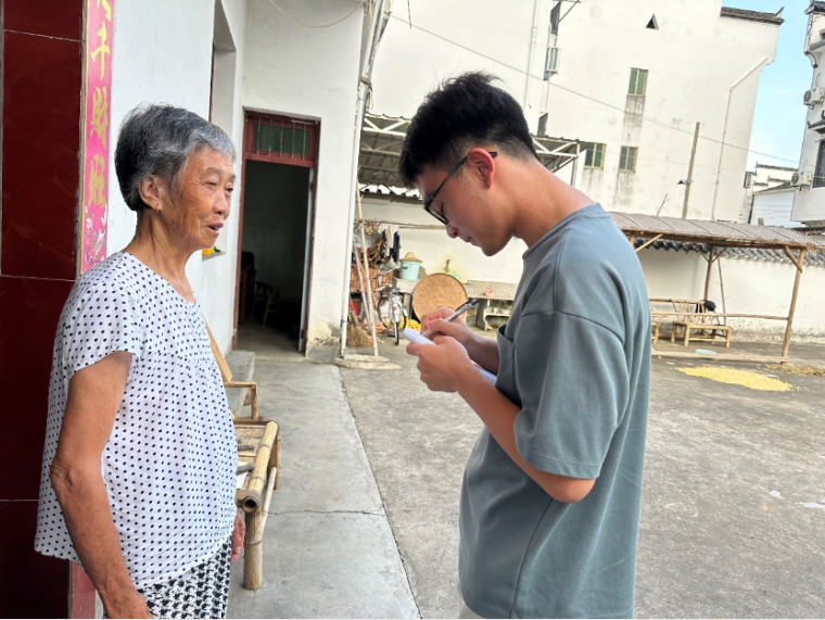 实践队成员甘文凯在婺源县漳村与村民面对面交流,深入了解了当地基层法律服务的现状和村民的需求。