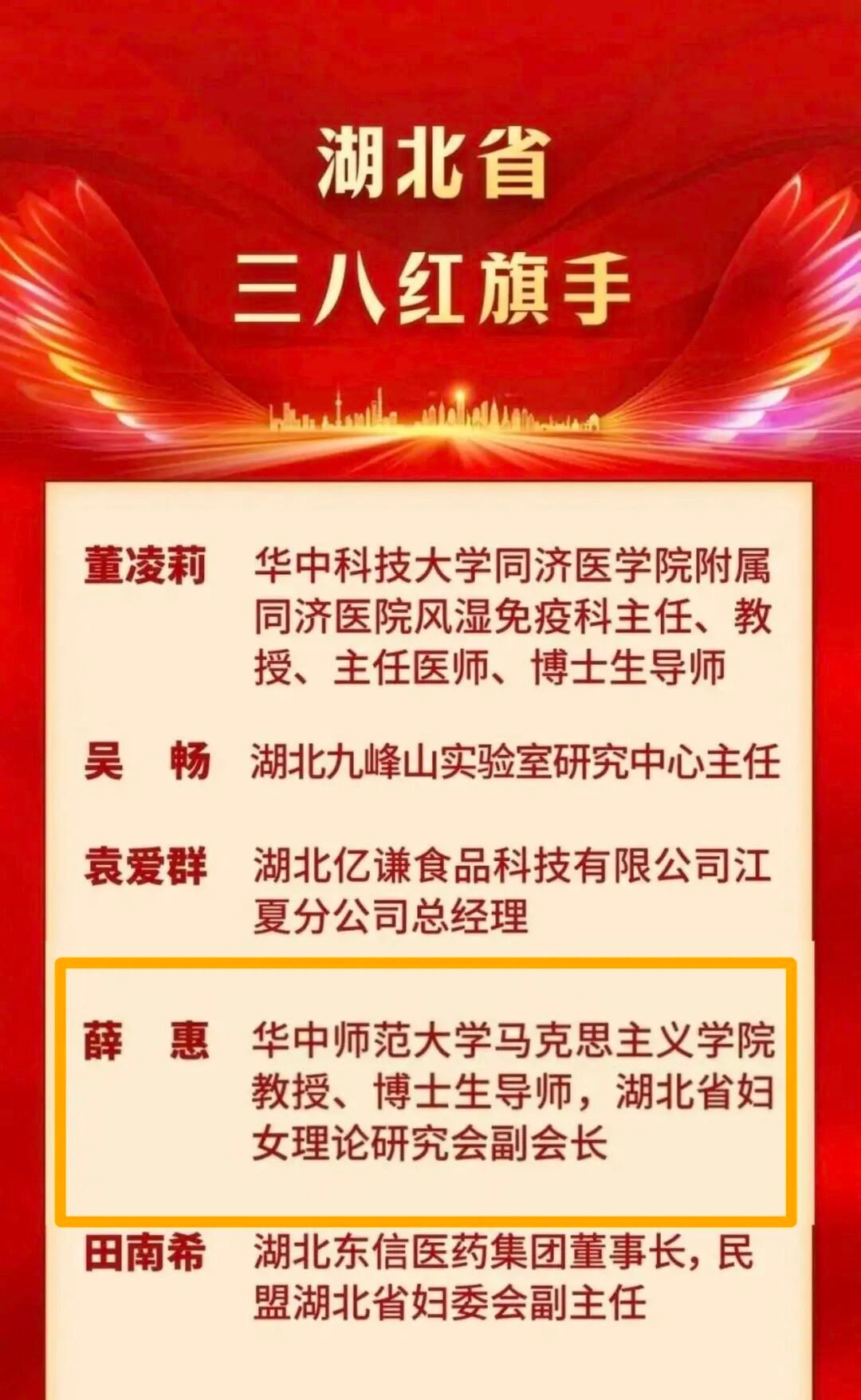 3月6日,湖北省各界妇女纪念“三八”国际妇女节116周年大会在武汉隆重召开,大会对全省先进妇女典型进行表彰,共授予70个集体、100名个人相关荣誉。法学院杰出校友、北京德和衡(武汉)律师事务所常务副主任谭玉华荣获“湖北省三八红旗手标兵”称号;法学院杰出校友、我校马克思主义学院教授、博士生导师薛惠荣获“湖北省三八红旗手”称号。