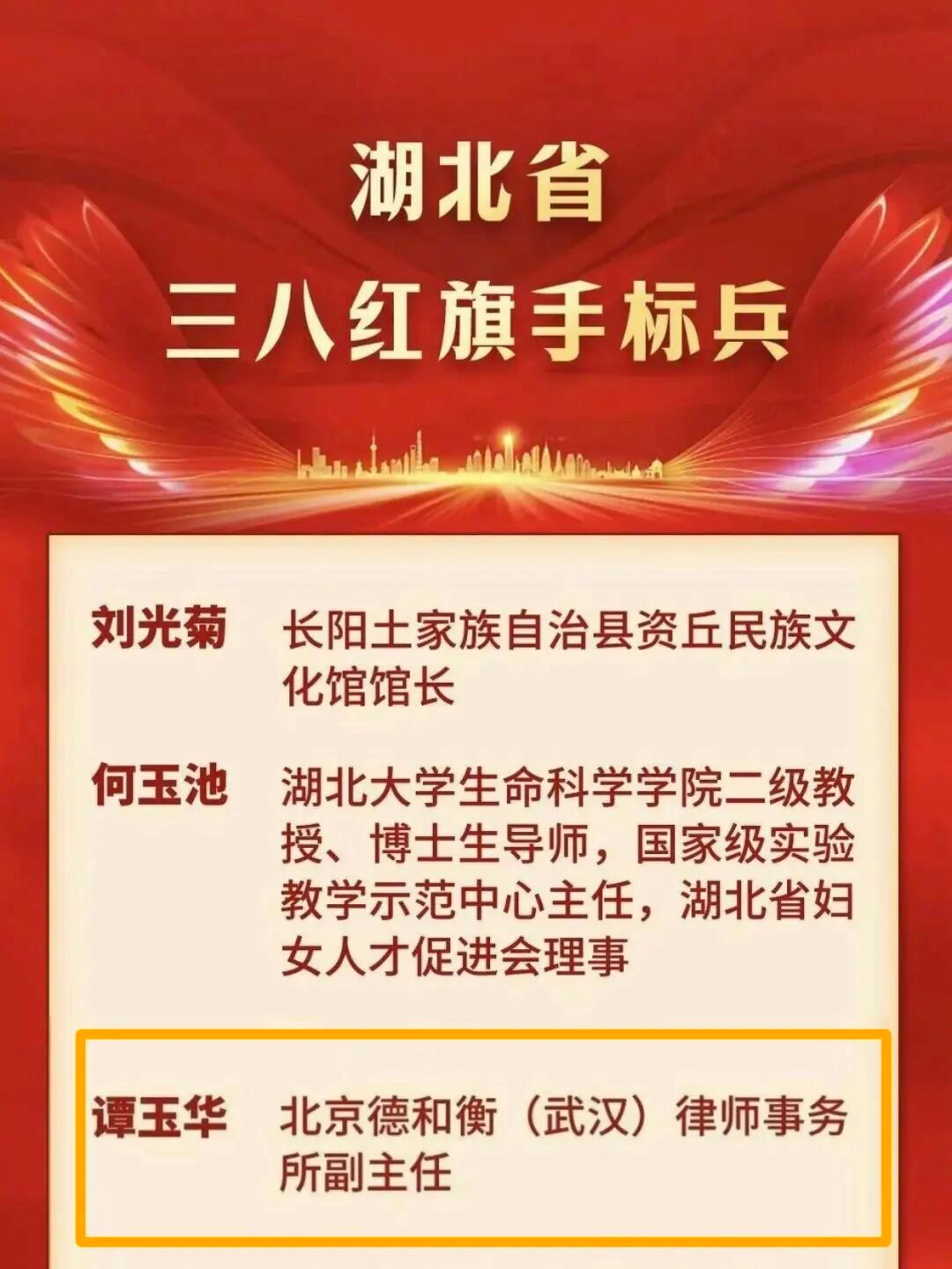 谭玉华,土家族,中共党员,现于北京德和衡(武汉)律师事务所担任常务副主任、高级合伙人。担任硚口区第十四届、十五届政协委员、硚口区第十三次党代表、武汉市第十四次党代表,武汉市律师代表,武汉市、湖北省妇女代表;现任武汉市律协房地产专委会副主任、武汉市行政复议专家委员会委员、湖北省婚姻家庭法专委会副主任,武汉市妇联执委,湖北省妇联常委。自2013年7月执业以来,十二载深耕不辍,斩获多项殊荣,主要有:2018年被评为武汉市十佳“满意社区律师”,2019年至2023年连续五年被评为“百名优秀社区律师”,获批武汉市十大个人命名社区法律顾问工作室之一——谭玉华工作室;2019年被评为武汉市第一届“青年律师领军人才”;2021年被武汉市律师行业综合党委评为“优秀党员”;2021年她被评为武汉市律师协会房地产委员会优秀委员,2022年获得硚口区“优秀政协委员”、武汉市“最美岗花儿”的称号,2023年被武汉市妇联评为“最美妇联人”、武汉市“巾帼英雄”、同时被武汉市总工会评为“先进生产优秀个人”,2024年被评为武汉市优秀青年律师、湖北省优秀党员律师、湖北省三八红旗手,2025年跻身湖北省百名爱心妈妈集体。