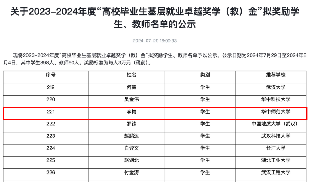 法学院讯(记者 法轩)7月29日,中国教育发展基金会发布《关于 2023-2024年度“高校毕业生基层就业卓越奖学(教)金”拟奖励学生、教师名单的公示》,我院2014届本科毕业生李梅入选。奖项由中国教育发展基金会设立,奖励对象为赴基层就业并做出突出业绩的普通高校毕业生和指导服务大学生赴基层就业工作有突出贡献的普通高校教师。李梅现在宣恩县人民检察院工作。