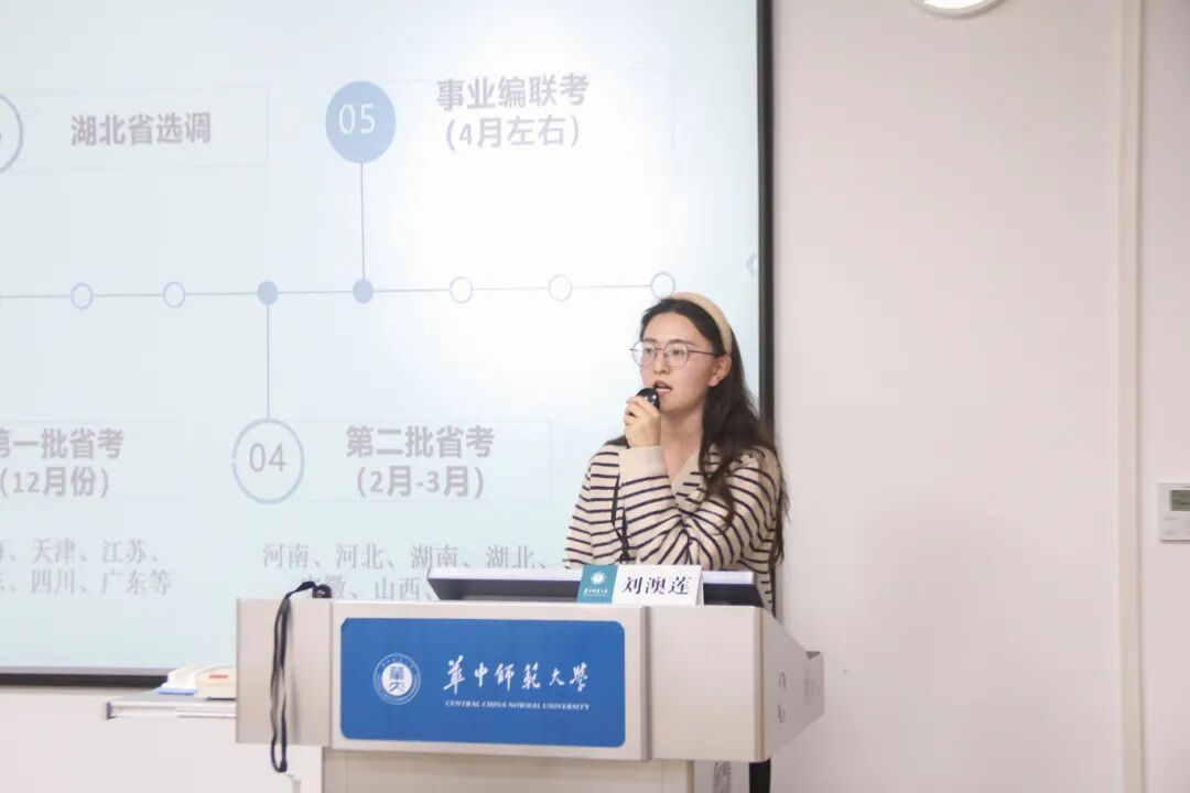 11月30日,由华中师范大学研究生会主办、华中师范大学法学院承办的秋招经验分享会·公务员专场在文科科研楼w333成功举行。本次分享会邀请我院2025届研究生、2025年省考笔试第三、面试第一上岸的魏佳琪和刘澳莲分享公务员备考经验,吸引了众多有志于公考的研究生到场交流。