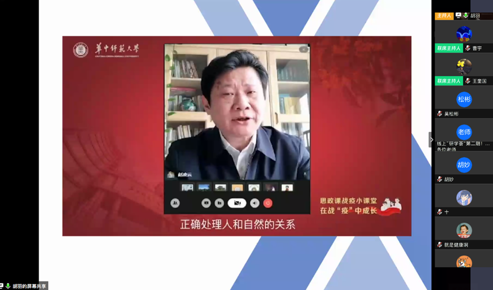 赵凌云书记、彭双阶副校长等领导、嘉宾全程在线观摩本堂研究生“线上点名”主题教育示范课。彭双阶副校长受赵凌云书记委托对本次课程进行点评。他认为:一是本次活动切入点好!充分体现了把抗疫作为责任教材的要求。二是内容好,分别探讨我们的环境责任、公共责任、以及履行责任的义务。三是方式好,既实现了教与学的互动,实现了学与思的结合,又实现了理论与实际的结合。并对研究生院(党委研工部)策划、法学院组织这个活动,法学院研究生思政工作团队和胡羽老师的辛勤付出表示感谢,并祝同学们身体健康,学业进步!