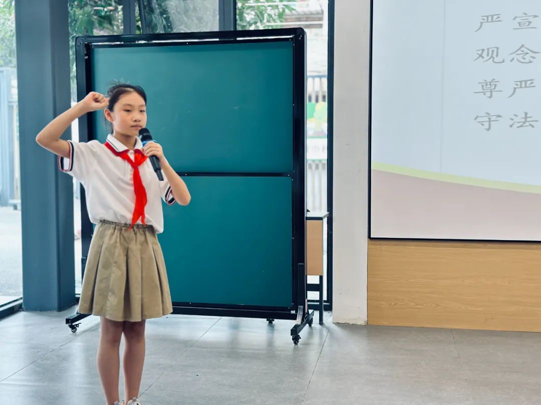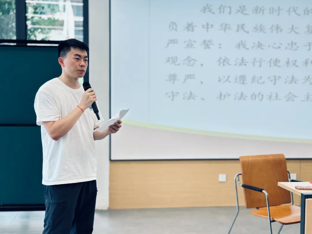 签约授牌仪式后,四二班同学在郝若言的带领下进行宣誓。同学们表示要忠于宪法和法律,认真学习法律知识,增强法律观念,依法行使权利,忠实履行义务,坚守社会正义,维护法律尊严,以遵纪守法为荣,以违法乱纪为耻,做一名学法、用法、守法、护法的社会主义接班人。