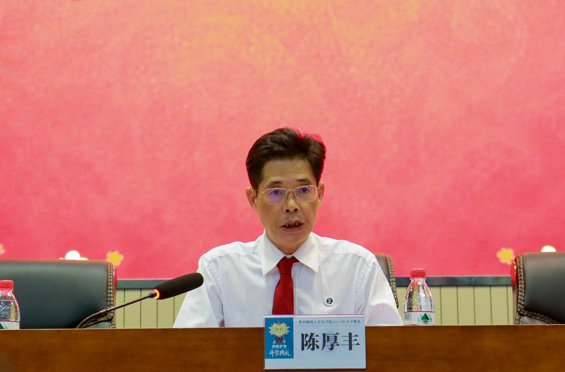 陈厚丰代表学校向新生表示热烈欢迎,他表示,百廿老校,立德树人,不忘初心,学校发展的每一篇华章,都致力于让同学们成为更好的自己。他希望法学院学子牢记初心,坚守正道。坚守正道,就是要坚定理想信念、矢志报国的决心,勇担时代大任;要坚定躬身力行、艰苦奋斗的耐心,点燃拼搏之志;要坚定担当作为、一心向善的信心,突出实干之行。他希望同学们求真学问、练真本领,不负时代,不负韶华,在120周年的桂子山留下最美的青春回忆。