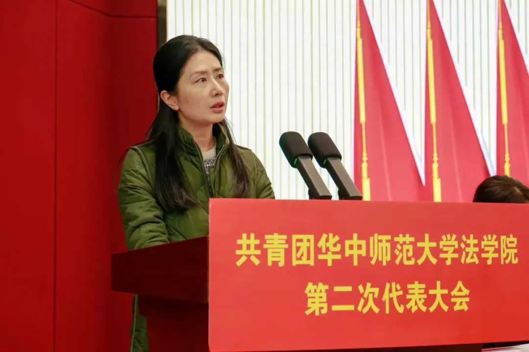 雷晓婷代表学校团委,向大会召开表示祝贺,也向兄弟院校团干表示欢迎,向全院青年表示问候。在讲话中她肯定了法学院共青团六年来取得的优异成绩以及为华师共青团事业所作的贡献,并代表学校团委向法学院团员青年提出三点希望。一是希望法学院团员青年要进一步增强高举团旗跟党走的政治自觉,听党话,跟党走,争做理想信念坚定的新时代好青年;二是希望法学院团员青年要进一步提高围绕中心、服务大局的政治站位,锐意进取,追求进步,争做矢志拼搏奋斗的新时代好青年;三是希望法学院团员青年进一步锻造全面从严治团的政治担当,发扬斗争精神,增强斗争本领,争做勇担时代重任的新时代好青年。