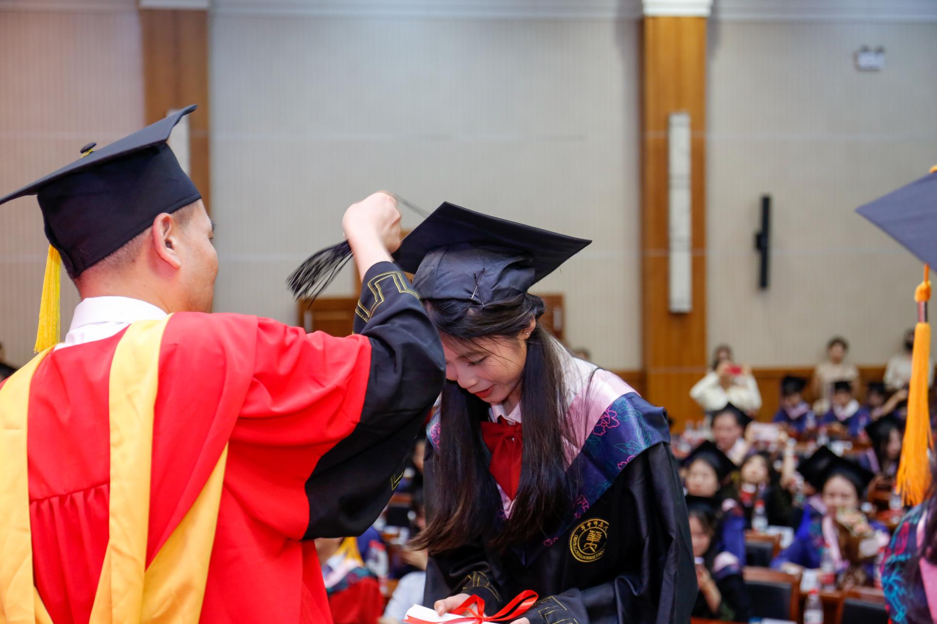 学位授予环节,由肖登辉宣读学士学位授予名单,文杰宣读硕士学位授予名单。刘继文、丁文、肖登辉、程亚萍、杨婷为学士学位获得者拨穗并颁发学位证书;刘继文、丁文、文杰、王清军、杨彩霞为硕士学位获得者拨穗并颁发学位证书。