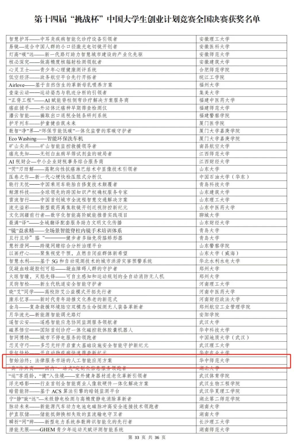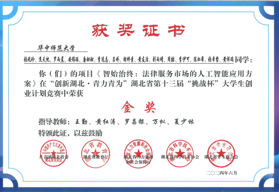 10月29日—11月2日,由共青团中央、教育部、人力资源保障部、中国科协、全国学生联合会、陕西省人民政府主办,西安交通大学承办的第十四届“挑战杯”中国大学生创业计划竞赛全国总决赛在西安落下帷幕,我院“智始治终:法律服务市场的人工智能应用方案”项目荣获主体赛国家级铜奖。同时,该项目在今年6月份落幕的“创新湖北·青力青为”湖北省第十三届“挑战杯”大学生创业计划竞赛中荣获省级金奖。