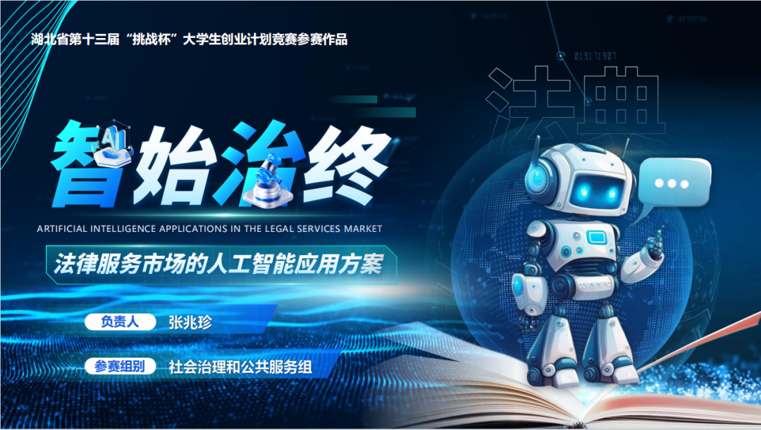 《智始治终:法律服务市场的人工智能应用方案》项目由王勤、黄红涛、罗昌银、万枞、夏少林老师指导,张兆珍、焦天忱、罗雨晨等同学组成项目团队。自2023年3月启动挑战杯助推计划以来,项目组成员前往湖北、江西、浙江、河南、山西、安徽等地开展多次实地调研,努力挖掘法律服务需求方面的难点与痛点。通过“AI对话客户、生成客户需求画像—AI提供业务选项、生成策略推荐画像—AI计算数据、生成律师服务画像”的服务流程解决法律服务咨询价格高、沟通效率低、信息不对称等痛点问题,运用人工智能、大数据等先进技术优化公共服务,在社会治理的齿轮中传递数字正义。