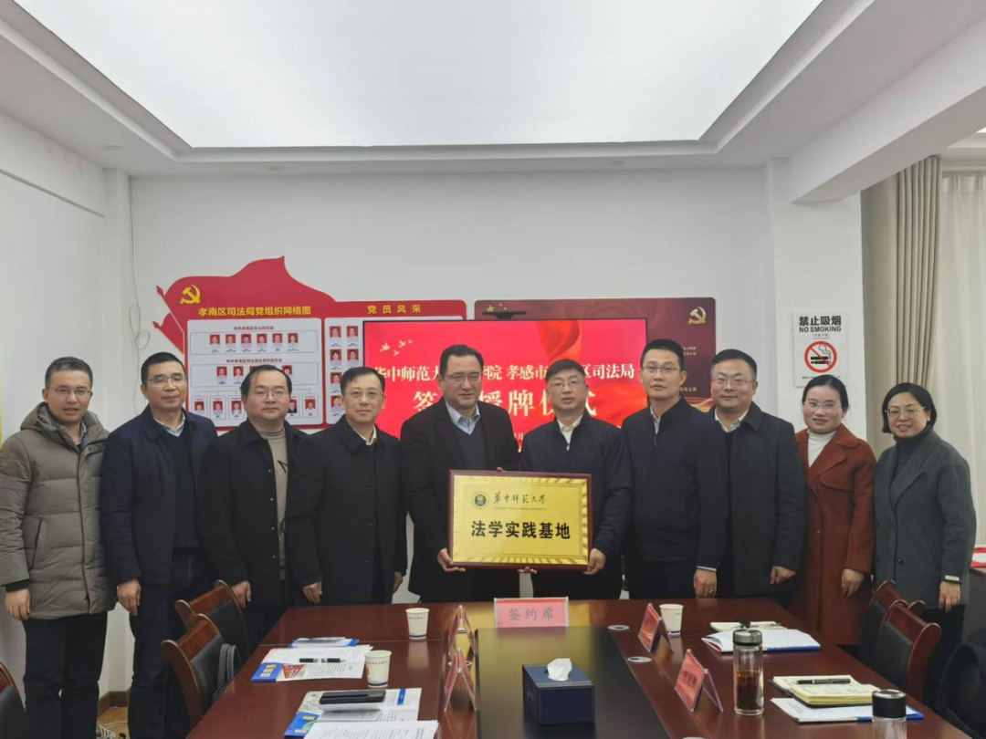 2024年12月12日,华中师范大学法学院与孝感市孝南区司法局签约授牌仪式在区司法局三楼会议室隆重举行。华中师范大学法学院党委书记杨臣,院长丁文,副院长文杰、肖登辉,院长助理王清军,孝南区副区长巫阳朔、区政府办公室党组副书记、副主任肖明,孝南区司法局党组书记、局长刘永辉、副局长李云、党组成员周为出席本次签约授牌仪式。孝南区司法局各股室处局负责人和书院律师事务所、名流律师事务所、峰鼎律师事务所、董永律师事务所主任参会。本次仪式由肖明主持。