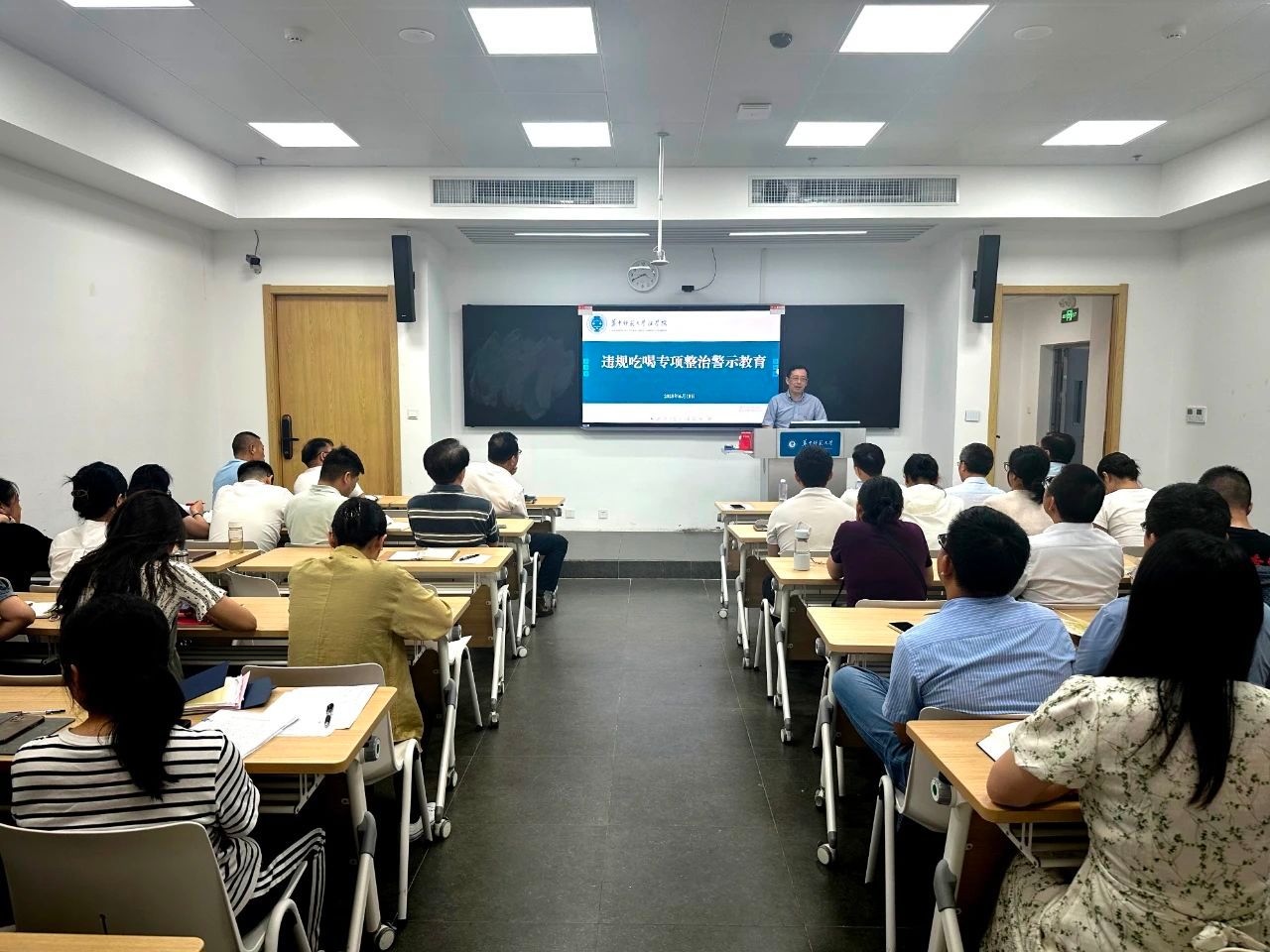 杨臣进行违规吃喝专项整治警示教育,他结合近期中央层面深入贯彻中央八项规定精神学习教育工作专班、中央纪委办公厅公开通报2起党员干部违规吃喝严重违反中央八项规定精神典型问题,并结合近期酒驾醉驾案例,说明违规吃喝对于教师形象和本人的严重危害性,希望全体教职工做好表率,做好师德师风建设,做好意识形态工作,严守底线红线,做教书育人的大先生。