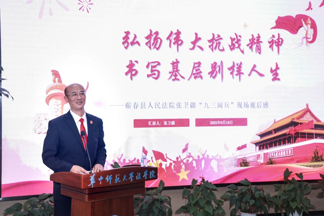 在宣讲中,张卫疆首先回顾了作为湖北省法院系统唯一现场参加纪念中国人民抗日战争暨世界反法西斯战争胜利80周年大会的体悟,带领大家再次回到荣耀现场。他回顾了自身三十余年的基层实践经历,通过具体案件,分享了自己坚守基层法院的心路历程,讲述了如何在法律理性、司法温度、道德要求之间寻找平衡。他寄语同学们深刻理解法治中国的真实图景、锤炼解决实际问题的能力、永葆理想主义与人文情怀,以专业与情怀书写法治人生。