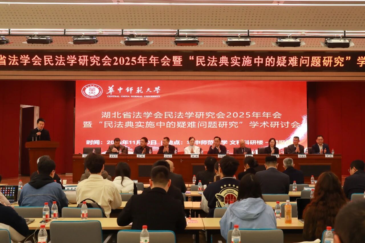 2025年11月30日,湖北省法学会民法学研究会2025年年会暨“民法典实施中的疑难问题研究”学术研讨会在华中师范大学文科科研楼一楼报告厅隆重召开。本次会议由湖北省法学会民法学研究会主办,华中师范大学法学院承办,湖北中和信律师事务所、武汉中南瑞达教育协办。湖北省法学会副会长、湖北省高级人民法院副院长陈旗,武汉仲裁委办党组书记、主任李章波,华中师范大学党委副书记、纪委书记刘继文,湖北省法学会民法研究会会长麻昌华,我院党委书记张扬、院长丁文等领导嘉宾以及来自武汉大学法学院、中南财经政法大学法学院、华中科技大学法学院等省内外高校和实务部门的一百多名专家学者和师生参加了本次年会。